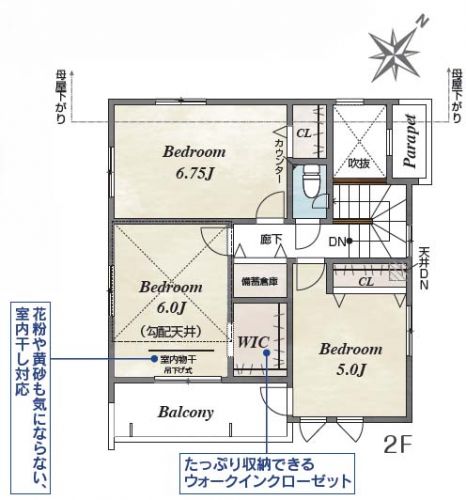 | 間取り | 3LDK(リビングダイニングキッチン 17.1帖(1階)、洋室 6.7帖(2階)、洋室 6帖(2階)、洋室 5帖(2階)、ウオークインクローゼット完備) | ||