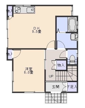 | 間取り | 3LDK(リビングダイニングキッチン 9.5帖(1階)、洋室 6帖(1階)、和室 6畳(2階)、洋室 4.5帖(2階)) | ||